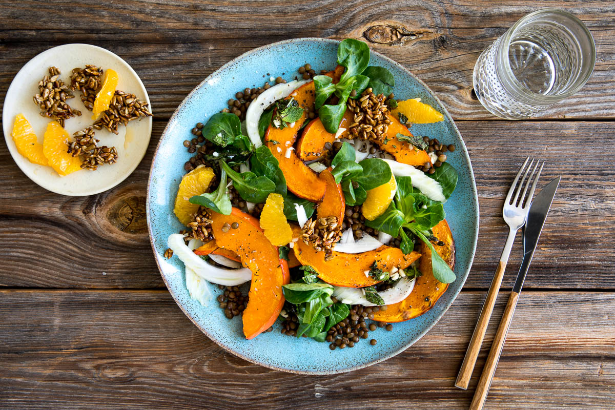 Gebackener Hokkaidokürbis mit fruchtigem Linsen-Fenchel-Salat