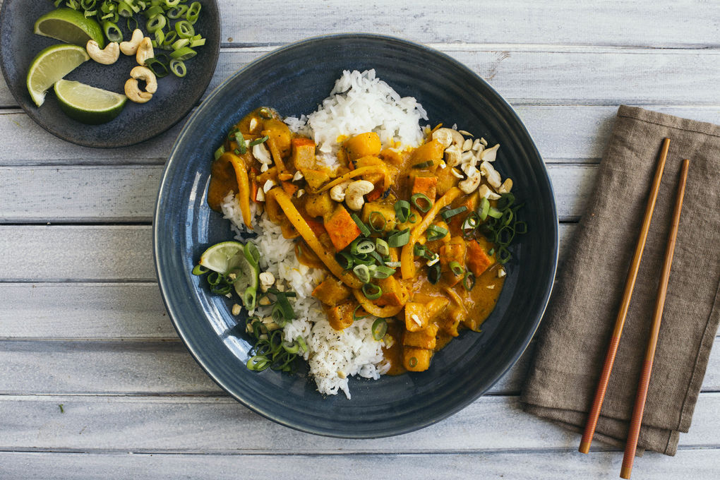 Kokos-Kürbis-Curry mit Cashews und getrockneten Aprikosen